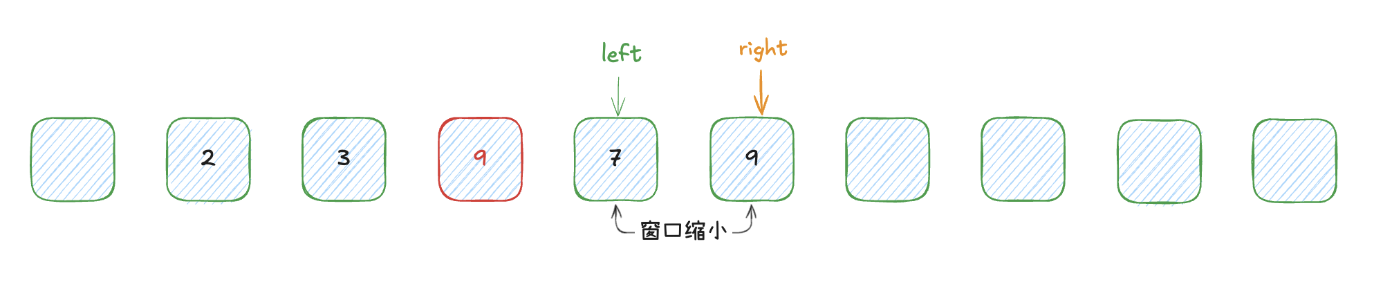 一个比较巧妙的思路,就是移动左边界到重复元素的下一个位置,让其不再参与计算。我们用图示来表达这个思路